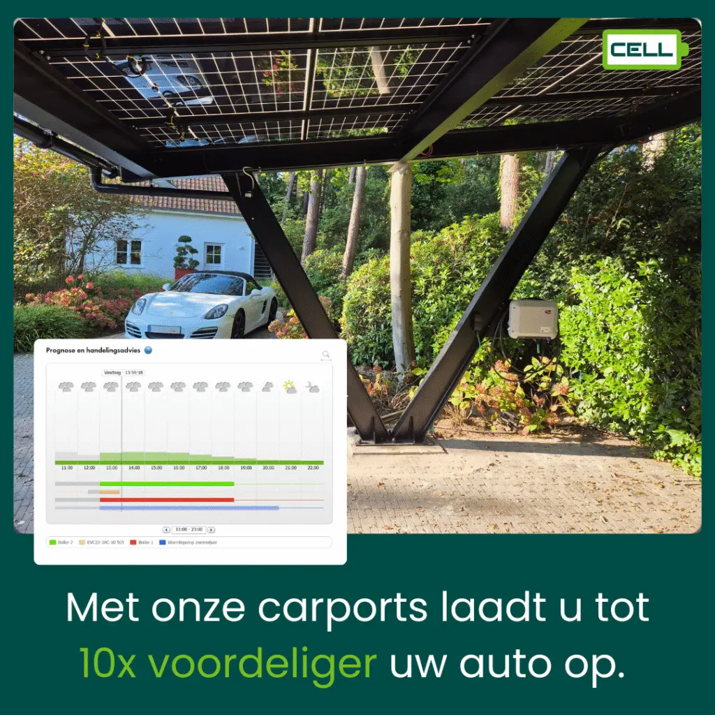 Met een solar carport van CELL laad je je auto al slim op met zonne-energie en goedkope stroommomenten. Een batterij kan later altijd nog toegevoegd worden als je je verbruik verder wil optimaliseren.